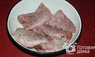 Морських окунів треба помити, обрізати всі плавці та почистити. Якщо риба велика – порізати порційними шматочками, скласти в одну ємність, посолити, поперчити і збризкати лимонним соком. Залишити маринуватися на 20-30 хвилин.