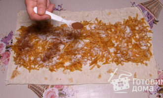 На лаваш викладаємо половину айви, рівномірно розподіляємо по поверхні, відступивши від верху і низу по пару см.