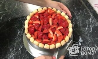 Торт збирається дуже легко, печиво Савоярді добре обмочуємо в полуничному сиропі з двох боків і щільно викладаємо один до одного у форму. Порожнечі заповнюємо маленькими шматочками.